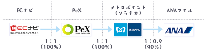 ECナビで貯めたポイントをPeX経由のソラチカルートでメトロポイントに移行すると、10%がECナビポイントとして還元される。